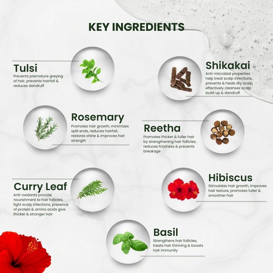 Ingredients: Aqua, Cocamidopropyl betaine, Lauryl glucoside, Sodium Lauroyl Sarcosinate, Decyl glucoside, Coco glucoside, Zemea propanediol, Glycerin, Triethanolamine, Phenoxyethanol, Triethylene glycol, Carbomer, Reetha extract, Shikakai extract, Hibiscus extract, Betaine, Niacinamide, Lemon extract, Aloe vera extract, Rosemary extract, Hydroxyethyl urea, Curry leaf extract, Rice water extract, Basil oil, Salicylic acid, Sodium gluconate, Allantoin, Fragrance Rosemary oil, Tulsi Reetha.