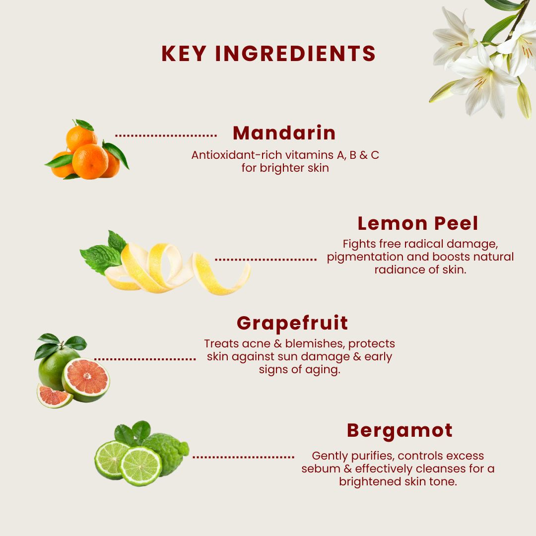 Brightens Skin: The combination of mandarin, lemon, grapefruit, and orange extracts helps brighten dull skin and even out skin tone.