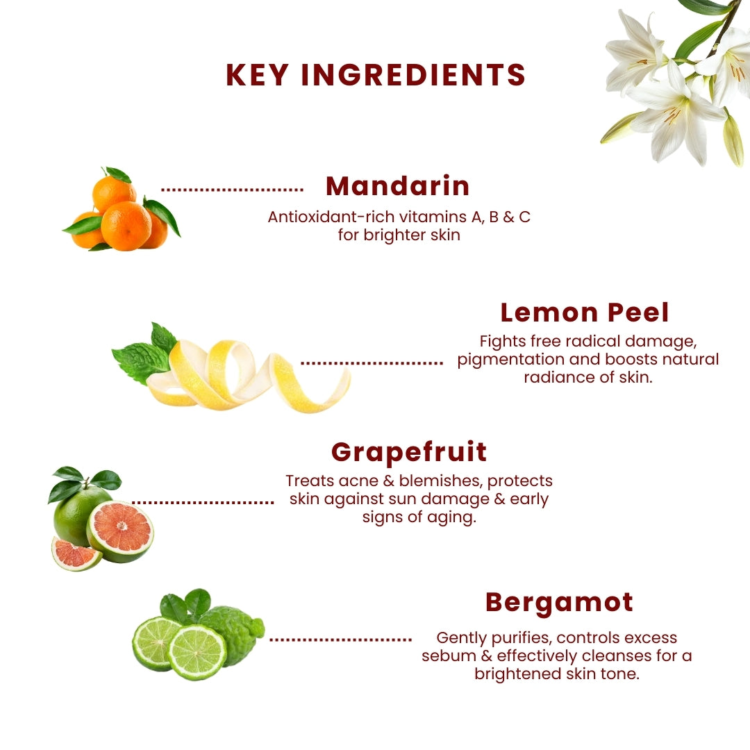 Brightens Skin: The combination of mandarin, lemon, grapefruit, and orange extracts helps brighten dull skin and even out skin tone.